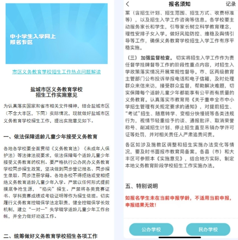 第二步 报名须知选报学校前,请家长务必耐心仔细阅读“报名须知”。阅读完毕,点击右下方“民办学校”按钮,进入下一步报名流程。第三步 阅读招生简章点击民办学校招生简章,进行阅读,阅读完毕后,请点击下一步。
