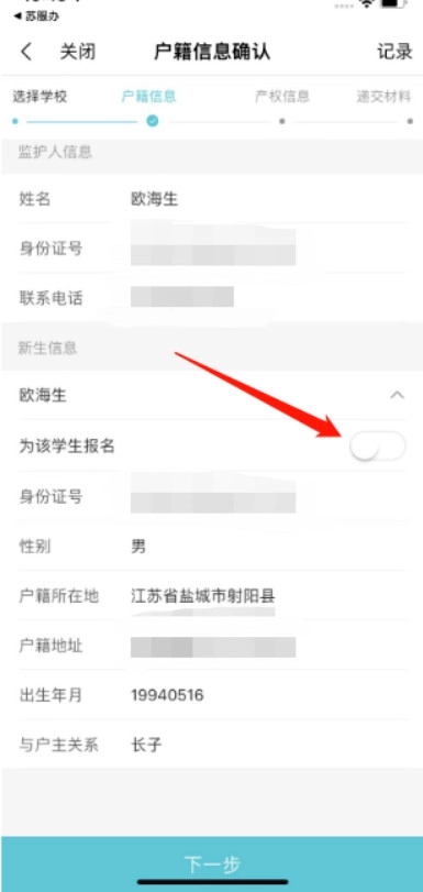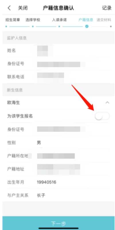 第六步 户籍信息确认当前户籍信息优先由填报人授权平台获取同户籍下家庭成员信息,选择箭头所指按钮为该生报名。并对相关信息核对确认,如未获填报人户籍信息的,需到线下进行报名。