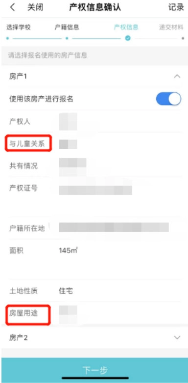 填写完整父母姓名、身份证号、联系方式等信息;特殊情形家庭在选择箭头所指按钮后,可选填父母信息,即可点击下一步。第五步 产权信息确认产权信息优先由填报人授权平台获取产权信息,在已自动获取到名下所有产权信息。选择报名使用的房产信息,填写“与儿童关系”(如是共有房产,则需填写儿童与所有产权人的对应关系)、“房屋用途”,点击下一步。并对相关信息核对确认,如未获填报人产权信息的,需到线下进行报名。