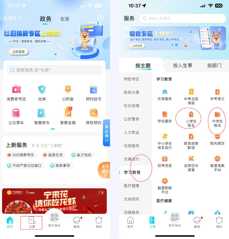 公办学校报名第一步 报名入口在首页点击“办事”,选择“学习教育”版块,根据需要选择“小学生报名”或“中学生报名”。