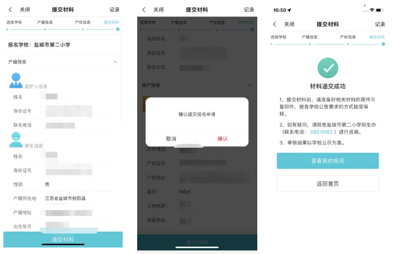 第六步 提交报名信息 提交前请再次确认填报信息(户籍信息、新生信息、房产信息)是否准确无误,点击“递交报名信息”,点击确认,报名信息提交成功。(报名信息递交成功后不能再作修改或重复报名,如提交后发现信息填写错误请线下报名。)