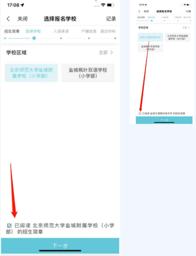 第四步 选报学校家长从列表中确认1所民办学校,并点击“已阅读招生简章”, 再点击下一步。