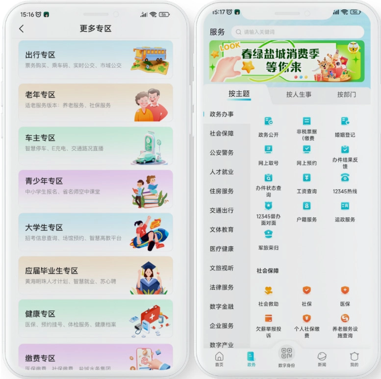 7. 推行文明行为积分制度,通过绿色出行、参与社会公益、坚守诚信守约等行为,共同建设文明城市。 1.我的盐城整体内含老年、青少年、大学生以及统一缴费、智慧出行等11个特色服务专区