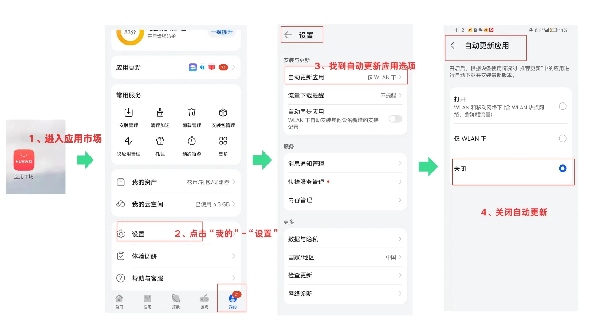 打开“华为应用市场”,点击左上角的三条横线菜单图标,进入后选择“设置”选项。在设置页面中找到“自动更新应用”这一项,将其设置为“不自动更新应用”。