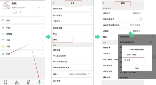 找到“自动微信安装包”选项,将其设置为“从不”。