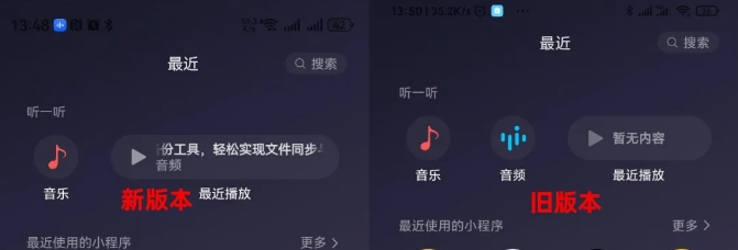 在微信聊天列表页下拉后,“听一听”板块里的“音频”选项已被取消,现在只剩下“音乐”和“最近播放”两个选项,并且这两个选项的内部功能也做了整合。