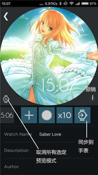 继续回到手机端操作。从图中可以看到,在编辑界面能够直接同步表盘。而撤销所有选定,是为了清除选定某一项时出现的蓝色选框,避免它对预览效果产生影响。