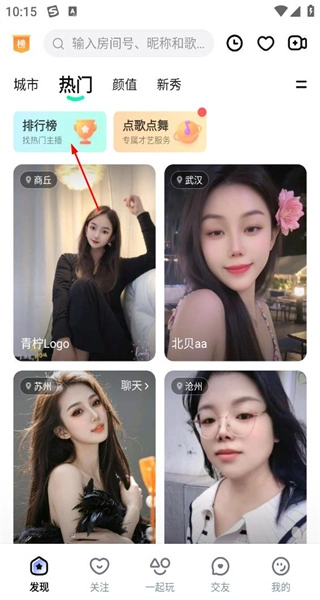 打开软件后,进入热门页面,能看到排行榜、点舞等功能以及用户展示,点击排行榜即可进入榜单选择页面。