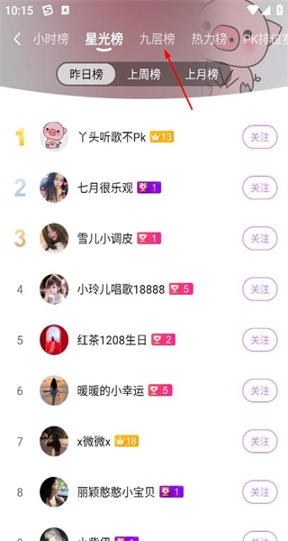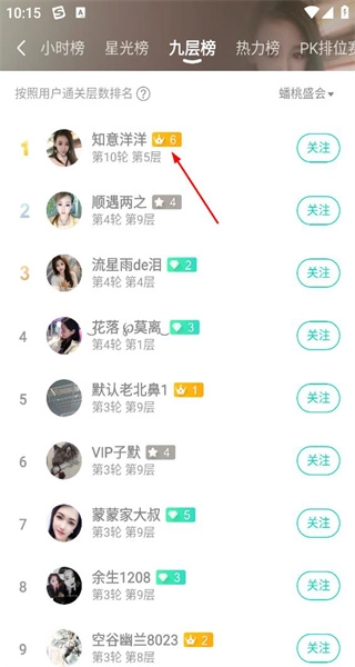 在榜单页面切换至九层榜,查看该榜单的用户排名及相关信息,从中挑选一位用户进入其主页。