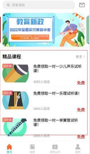 在首页搜索课程,找到心仪的内容,查看与教育、新政相关的课程,还可以借助精品课程板块来提升音乐知识和技能。