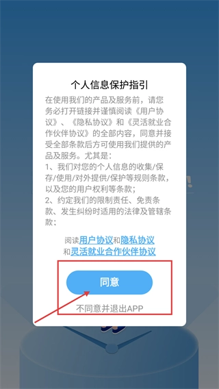 当出现【个人信息保护指引】弹窗时,点击【同意】按钮,就能进入应用的登录页面。