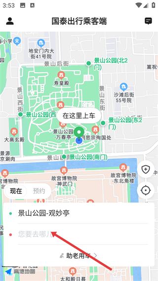 在国泰出行乘客端的主界面上,先确认起点显示为【景山公园-观妙亭】,接着点击【您要去哪儿】这个输入框,就可以开始填写行程的目的地了。