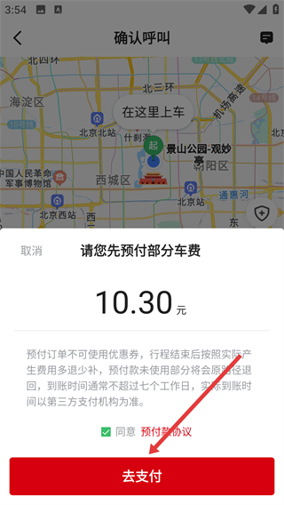 在预付车费的弹窗里,先勾选同意《预付款协议》,再点击“去支付”按钮,就能完成部分车费的预付流程。