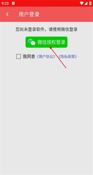 进入用户登录界面后,系统会提示当前处于未登录状态,需通过微信完成登录;页面设有微信授权登录按钮,且需先勾选相关协议,方可执行登录操作。