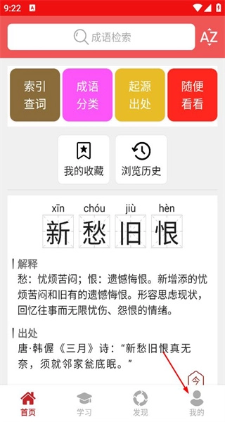 打开软件后,界面上设有成语检索、索引查词等功能按钮,会呈现“新愁旧恨”的释义与出处,点击“我的”即可进入对应的页面。