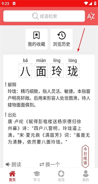 用户登录后会自动跳转回软件首页,页面将呈现“八面玲珑”的详细释义与出处信息;同时设有“我的收藏”和“浏览历史”功能按钮,底部导航栏则保留首页等原有的操作选项。