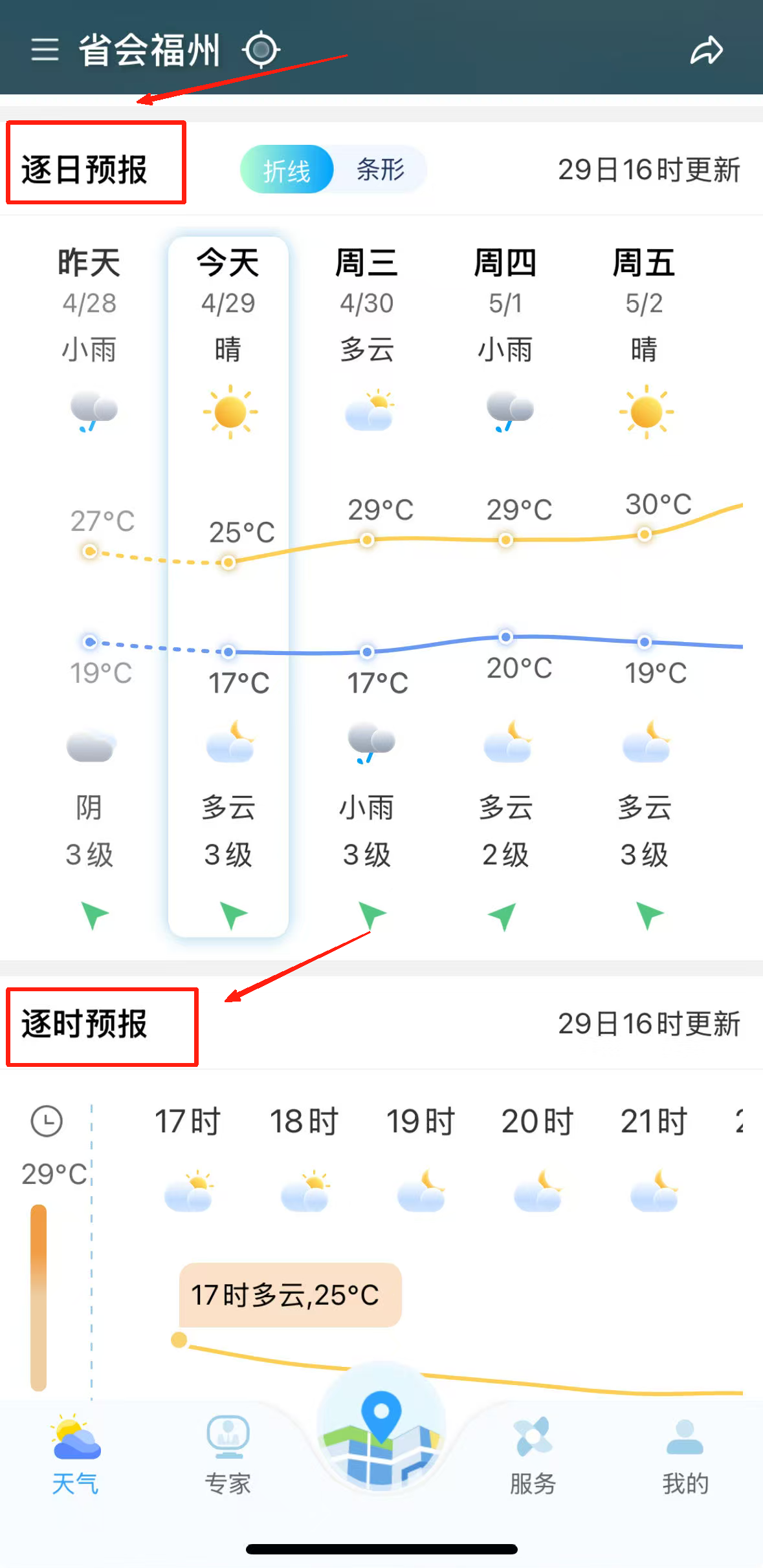 进入首页就能看到定位城市未来三天的天气趋势,向下滑动界面可获取逐小时的温度和降水概率。