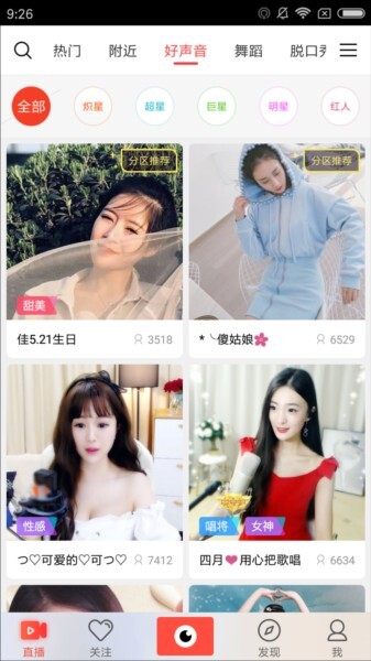 3、在附近分类里,能看到距离我们最近的主播,位置是可以自由切换的。而好声音分类,点击进入后可以快速浏览到一些排名非常靠前的主播,用户可以选择关注这些主播,方便之后继续观看他们的内容。