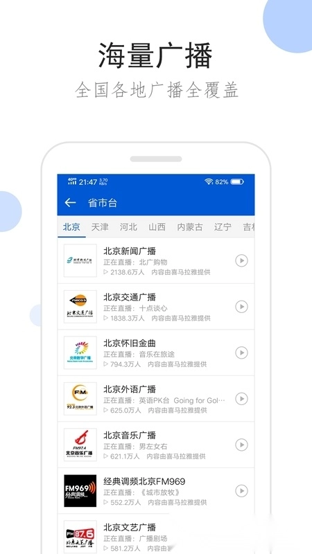 1.全国广播:覆盖全国各省市的广播电台,让你轻松收听来自全国各地的声音。 2. 家乡广播:可自动定位并呈现本地广播内容,随时聆听家乡的声音。