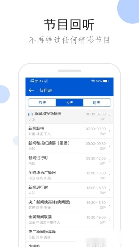 1.广播回听功能:可回顾昨日播出的节目,也能预约明日即将上线的内容,让每一份精彩都不会与你擦肩而过。