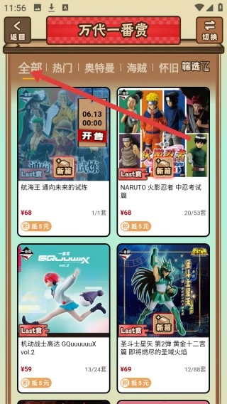 2、万代一番赏页面顶部设有“全部”“热门”等分类标签,陈列航海王、火影等手办信息,并标注价格、库存及开售时间,方便用户筛选心仪商品。