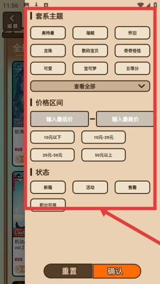 3、筛选页设有套系、主题、价格区间、状态等筛选选项,覆盖动漫IP、不同价格段及商品状态,支持精准查找,以满足用户个性化选购需求。