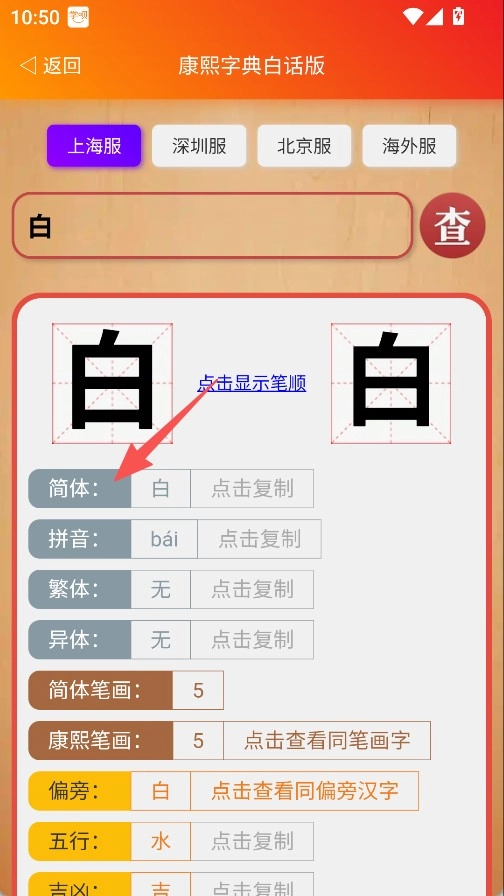 3、点击单个汉字,可查看该字的简体、拼音等详细信息。
