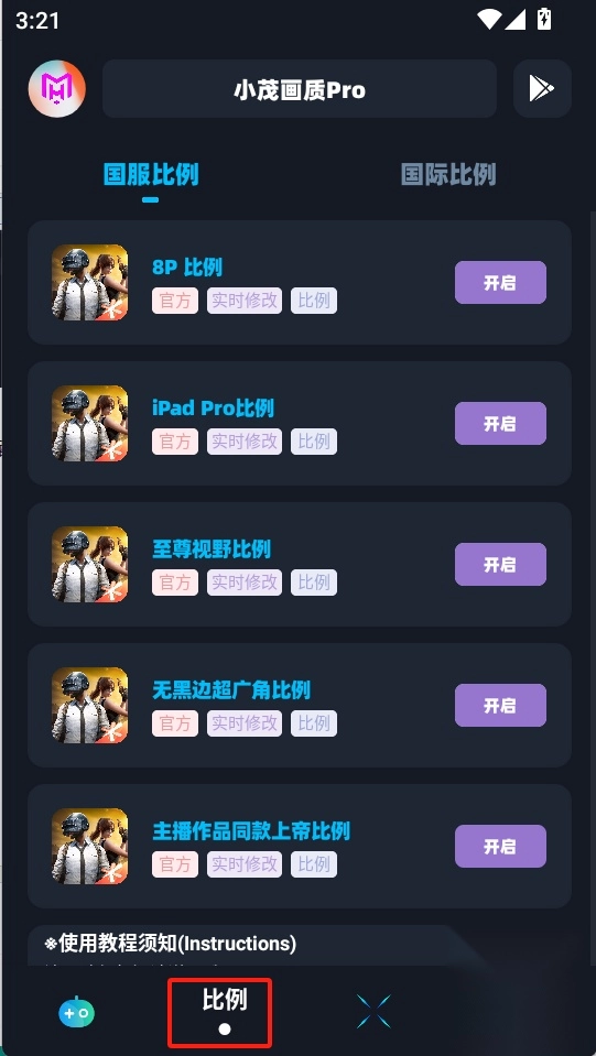 4. 点击底部第二个图标,即可开启你想要的游戏画面比例