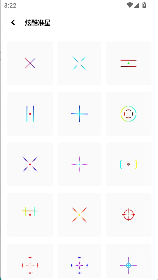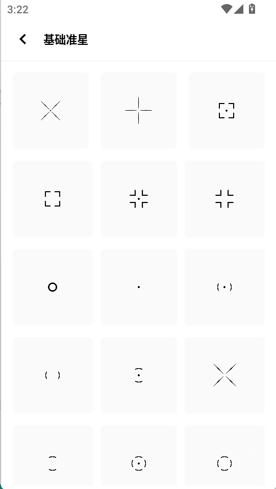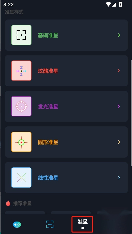 5. 点击底部第三个准星图标,即可开启准星样式设置,这里提供基础准星、炫酷准星、发光准星、圆形准星、线性准星等多种样式供选择。