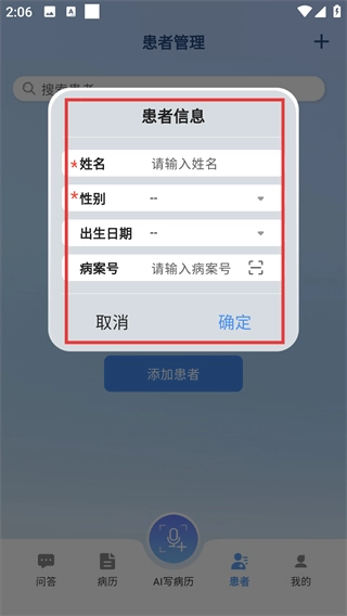 在患者管理页面点击【添加患者】按钮,即可弹出患者信息填写窗口,进而开始录入患者资料。