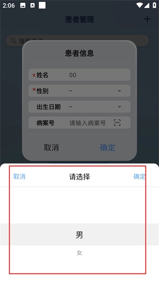 3、点击性别选择框,在弹出的选项中选择对应的性别(例如【男】),即可完善患者的性别信息。