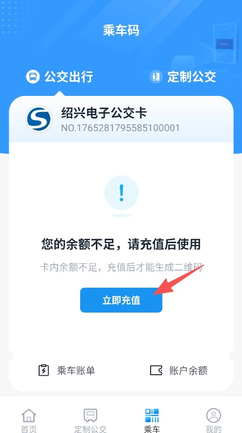 3、点击乘车板块,查看乘车码并进行充值操作。