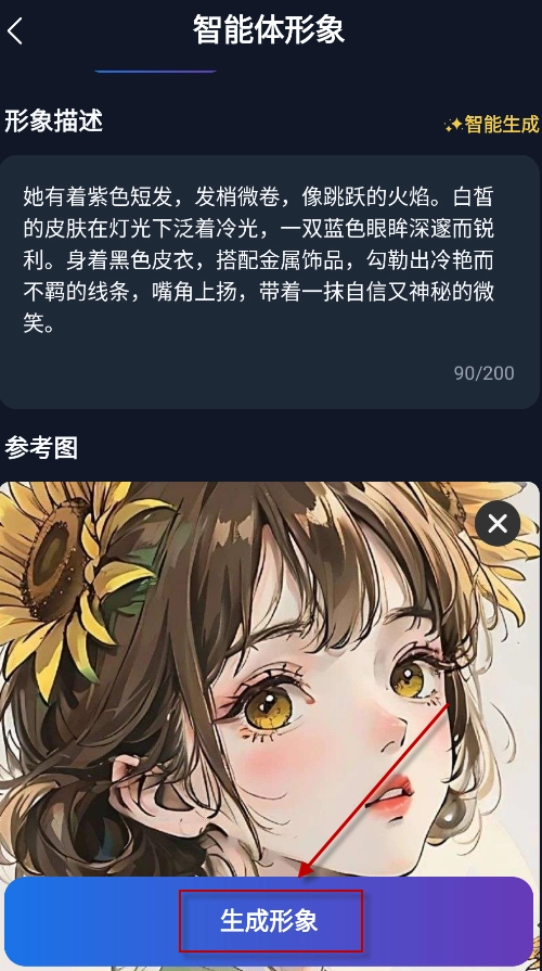 3、先对角色形象进行描述,再从手机相册里上传对应的形象图,之后点击“生成形象”这个选项。
