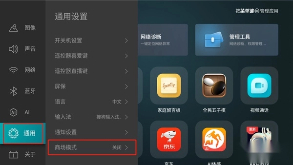 4、进入通用设置界面,找到商场模式选项并点击,将其状态切换为“开启”。需要注意的是,若未开启该模式,媒体中心内将不会显示安装包文件。