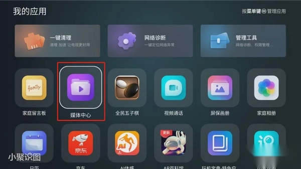 5、回到我的应用中,点击【媒体中心】。