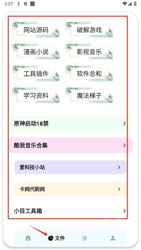 3、点击“文件”选项,这里汇集了各类丰富资源,涵盖音乐、影视、小说等多种类型。