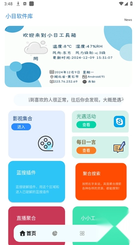 在首页,您能够看到影视集合、聚合搜索、直播聚合等板块的内容。