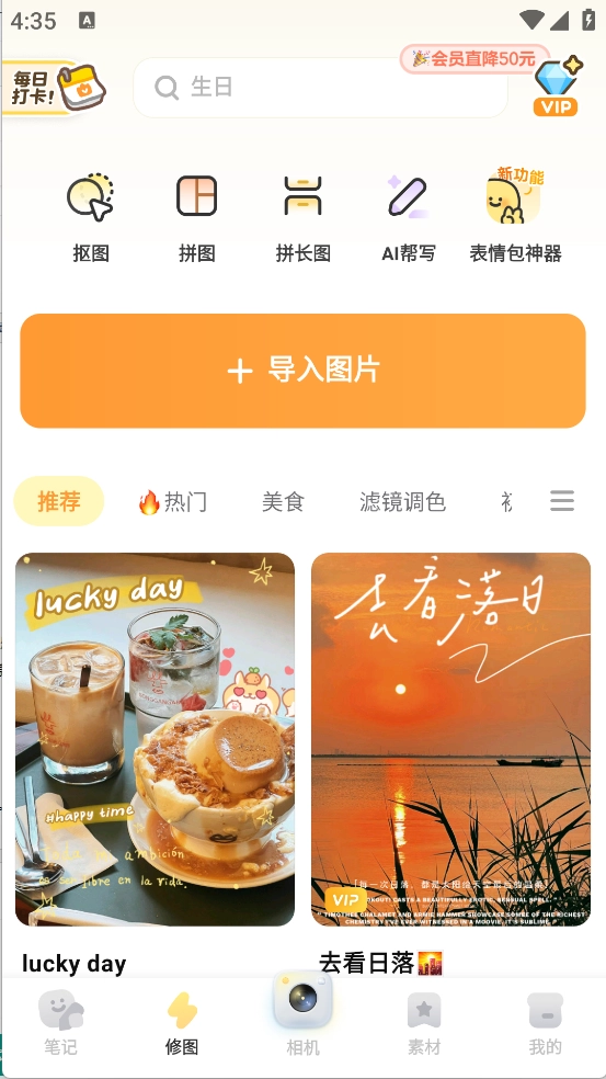 3、拍摄与导入图片:点击应用内的相机按钮即可拍照,也可以从手机相册里挑选已有的图片来进行编辑。