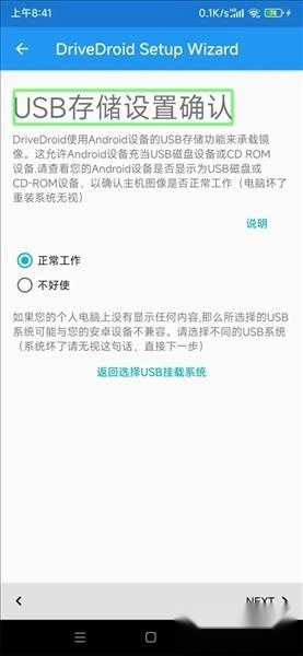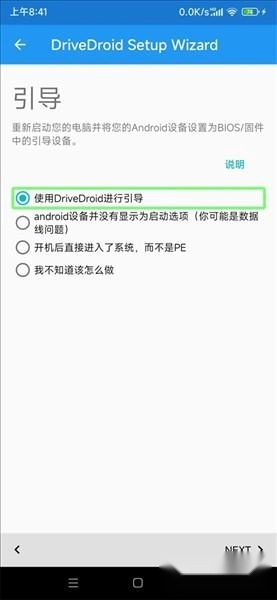 接下来要选择引导方式,选择“使用DriveDroid进行引导”,然后点击两次next按钮,这样就能完成配置向导了。