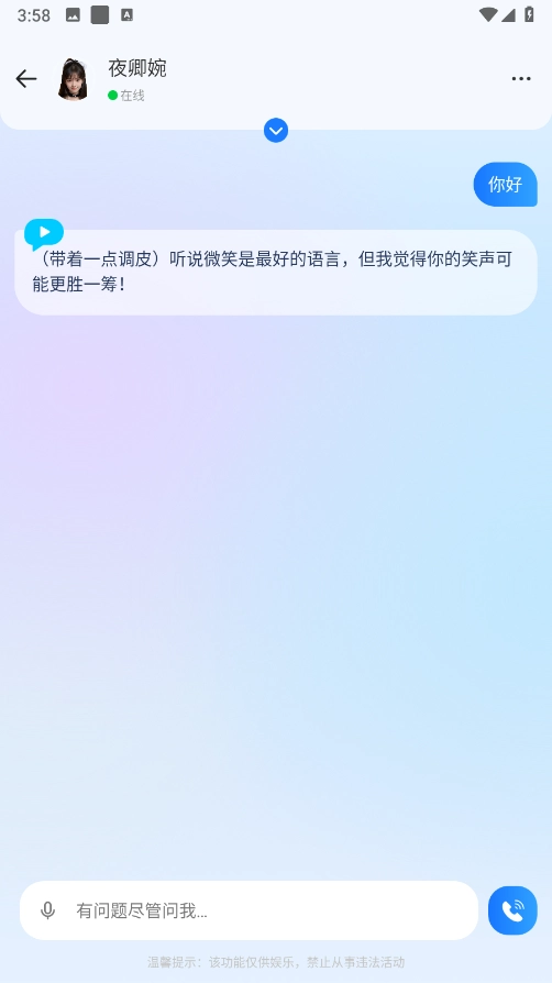 4、在对话框里输入文字或是拨打语音电话,AI都会第一时间回复你,感觉就像和朋友聊天一样。