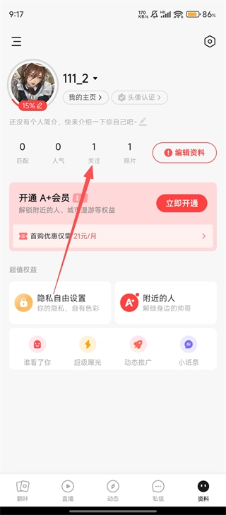 1、我们打开翻咔的【资料】页面,找到并点击【关注】选项,即可查看关注列表。