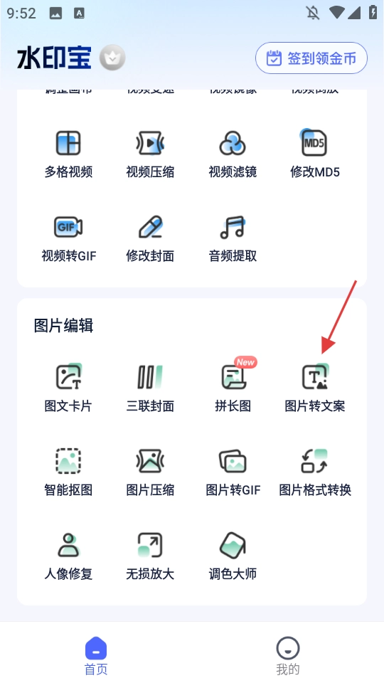 1、在图片编辑板块找到并点击【图片转文案】功能按钮,即可进入对应的图片转文案操作页面。