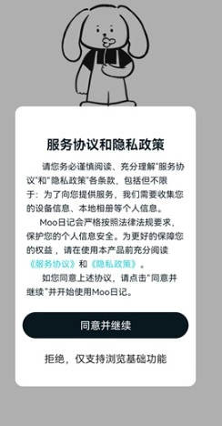 1、打开Moo日记旧版本,点击“同意并继续”进入应用;