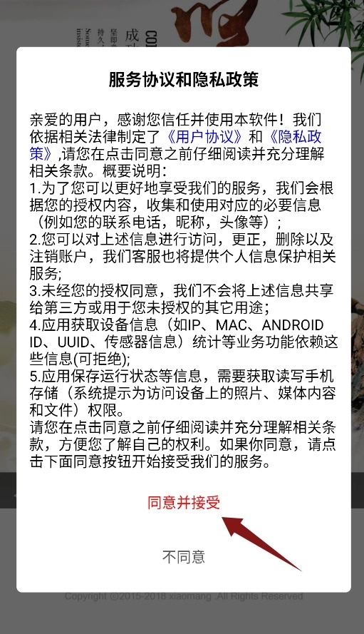 1、启动应用时会显示服务协议与隐私政策,需点击同意并接受方可进入。