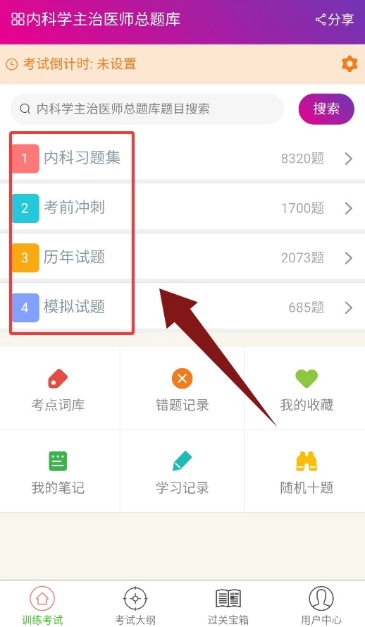 2、训练考试页包含内科习题、考前冲刺、历年真题及模拟试题练习。