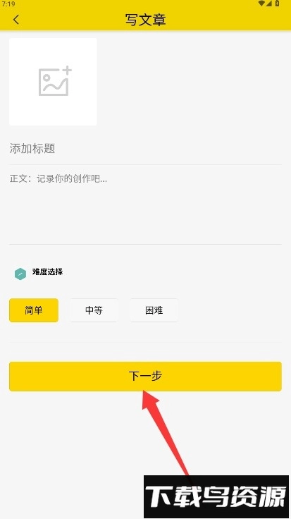 3、上传相关图片素材,填写文章标题和正文内容,选择难度等级后进入下一步。