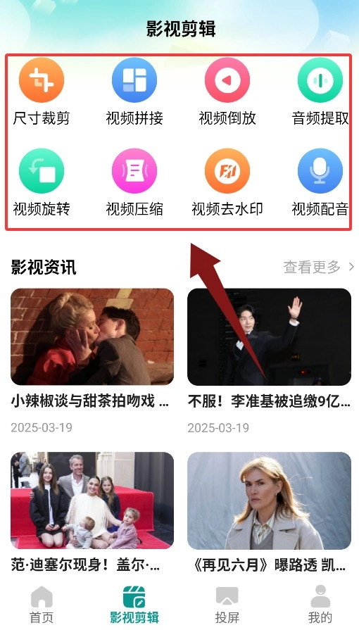 3、影视剪辑页面提供尺寸裁剪、视频拼接、倒放及音频提取工具。