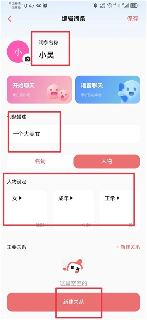 4、接下来要添加百科词条,在这一步里,你得先创建一个主要人物的设定,之后再为这个主要人物新增与之有关联的角色。等所有人物都创建完毕后,点击保存按钮就可以了。