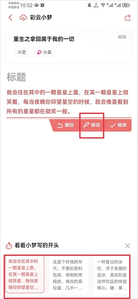 6、点击小梦后,将自动为你生成故事开头,你可以左右滑动来挑选合适的故事开头,选择后觉得内容不满意后你也可以点击修改进行内容改写