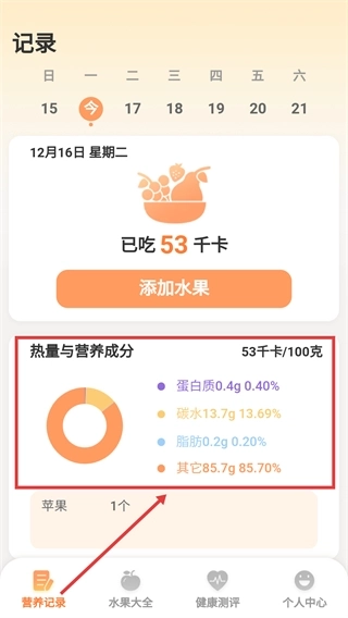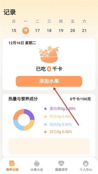 1、在【营养记录】页面点击【添加水果】按钮,就能进入水果选择界面,着手记录当天的水果摄入情况。